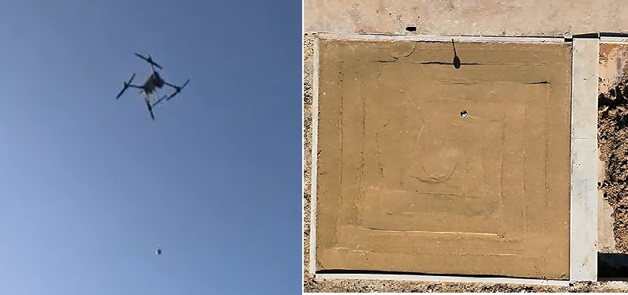 東北大学がドローンから球体を投下して地盤強度を推定するデモを行いました.写真は,ドローンから球体を投下している様子を示しています.