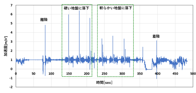 Tohoku University is developing a method to estimate ground strength by dropping a sphere equipped with an accelerometer from a drone onto the ground surface and estimating ground strength from the impact acceleration at the time of collision. The photo shows a sphere being dropped from a drone at Osaki Sanbongi Field. On the day of the demonstration, we prepared two test grounds with different ground strengths and showed the demonstration that the drone dropped the sphere to the ground surface to the. Afterwards, the difference in impact acceleration due to the difference in ground strength was displayed on a monitor so that the media can confirm the performance of the device.